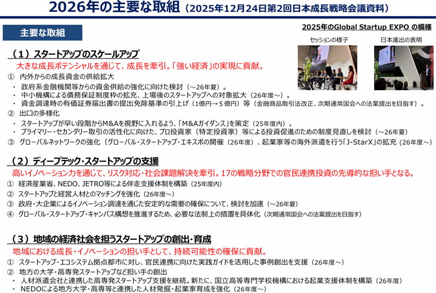 こうした状況を受け、高市政権では、成長戦略のうち、SU政策を横断的分野に位置づけ、日本成長戦略会議の下に「SU政策推進分科会」を今年2月に設置しました。大きく成長するSUが不足しているとして、①SUのスケールアップ、②ディープテックSUの支援、③地域の経済社会を担うSUの創出・育成の3本柱を掲げ政策を検討しています(図表1)。
