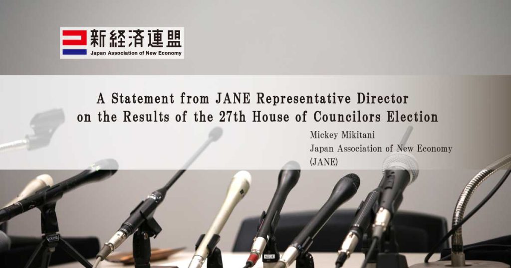 The Japan Association of New Economy (JANE. Location: Minato-ku, Tokyo; Representative Director: Mickey Mikitani) issues the following statement from its representative director in response to the results of the 27th House of Councilors election.