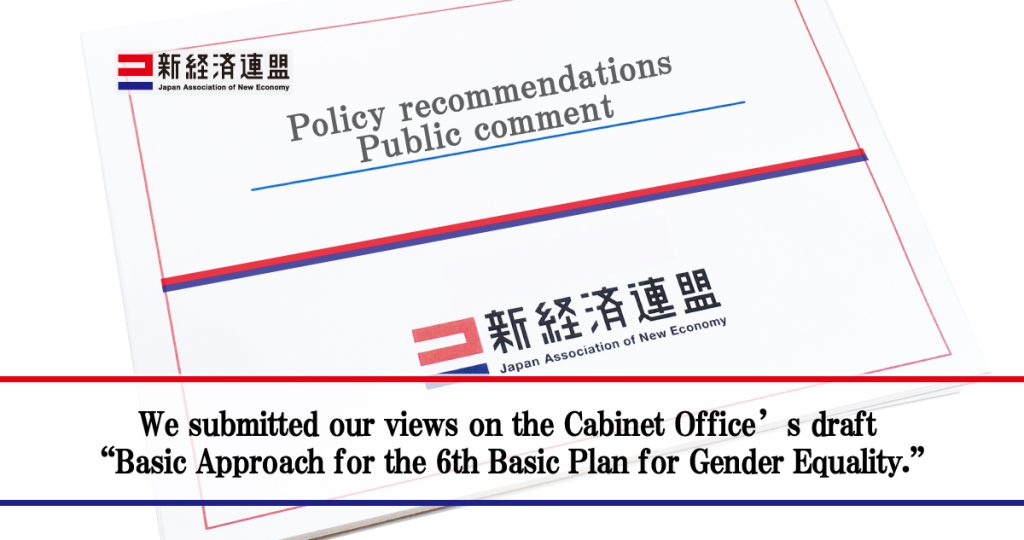 On September 12, 2025, the Japan Association of New Economy (JANE) submitted its opinion on the “Basic Approach for Formulating the Sixth Basic Plan for Gender Equality (Draft)” conducted by the Cabinet Office.