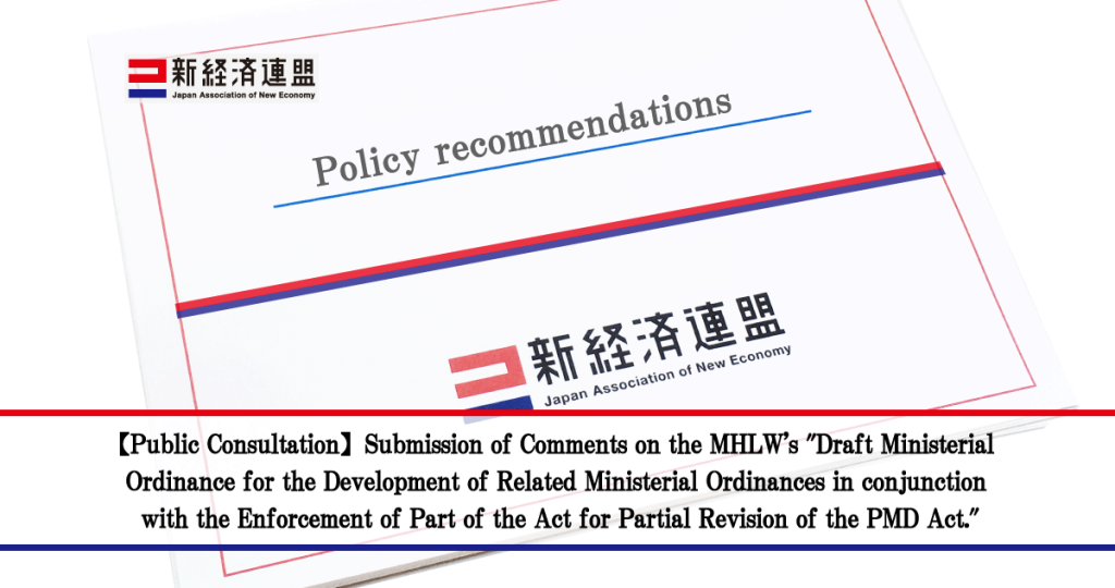 【Public Consultation】Submission of Comments on the Ministry of Health, Labour and Welfare’s “Draft Ministerial Ordinance for the Development of Related Ministerial Ordinances in conjunction with the Enforcement of Part of the Act for Partial Revision of the Act on Securing Quality, Efficacy and Safety of Products Including Pharmaceuticals and Medical Devices, etc.”
