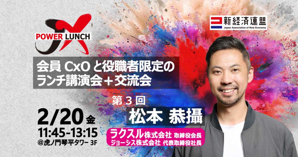- イベント名:【JX POWER LUNCH】ラクスル松本恭攝氏登壇!会員CxOと役職者限定ランチ講演会+交流会!
