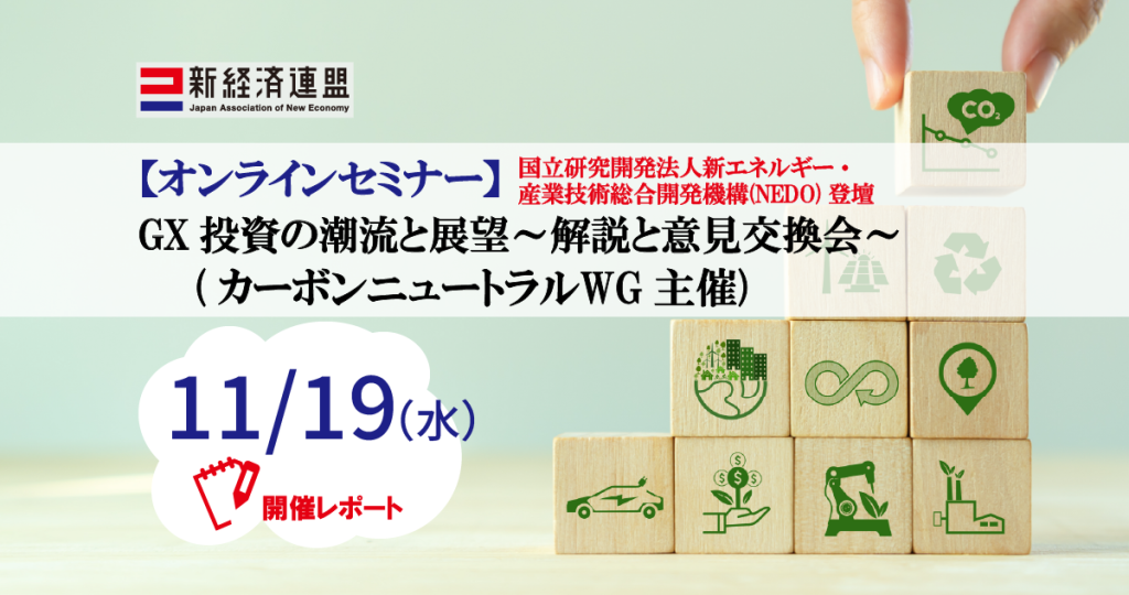 新経済連盟は、11月19日、新経済連盟カーボンニュートラルWG主催による「GX投資の潮流と展望」の解説と意見交換会を開催しました。