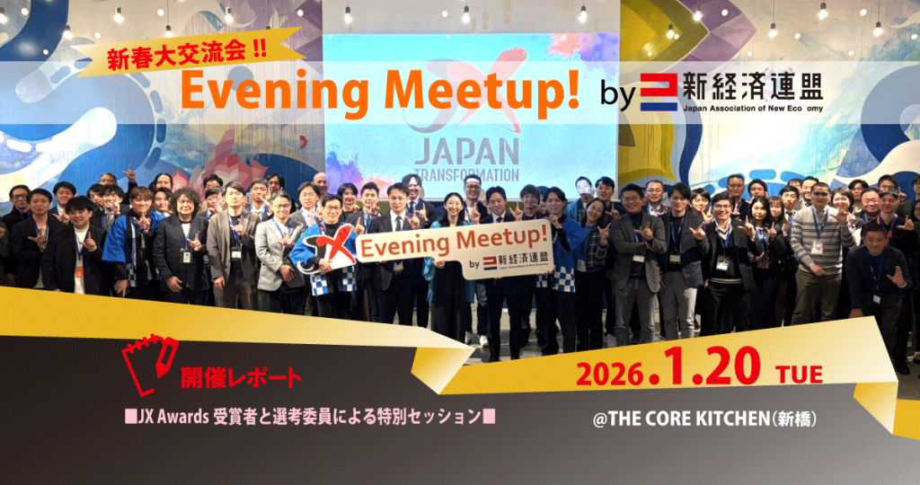 新春にふさわしく、挑戦する起業家たちのエネルギーが共鳴し合った一夜となりました。新経連では、今後も【Evening Meetup!】(EMU)を軸に、経営層をはじめとする多様な役職の方々がリアルに繋がり、ともに日本の変革(JX)を加速させる場を提供してまいります。次回の開催にもぜひご期待ください。