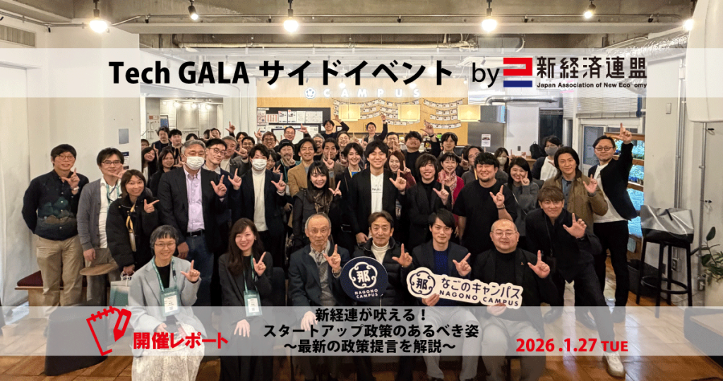 2026年1月27日(火)、新経済連盟(以下「新経連」)は、名古屋を中心に1月27日(火)~29日(木)の3日間にわたり開催された「Tech GALA 2026」のサイドイベントとして、「新経連が吠える! スタートアップ政策のあるべき姿!~最新の政策提言を解説~」を開催し、会場のなごのキャンパスには60名以上の方々にお集まりいただき、想定を超える大盛況のうちに終えることができました。