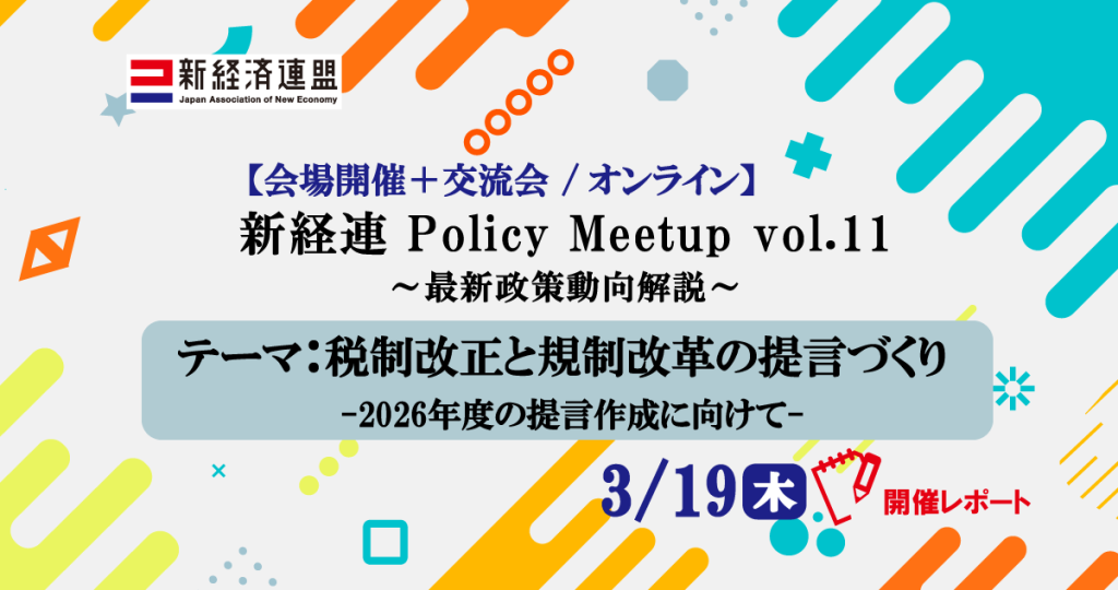 - 【会場開催+交流会/オンライン】新経済連盟 Policy Meetup vol.11(テーマ:税制改正と規制改革の提言づくり-2026年度の提言作成に向けて-)~最新政策動向解説~を開催しました