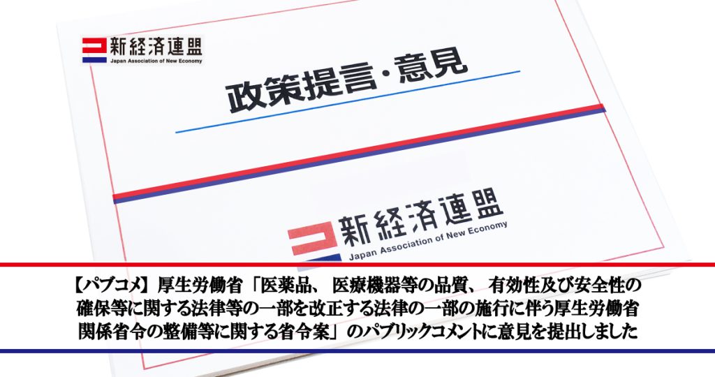 2025年11月1日、新経済連盟は、厚生労働省が実施した「医薬品、医療機器等の品質、有効性及び安全性の確保等に関する法律等の一部を改正する法律の一部の施行に伴う厚生労働省関係省令の整備等に関する省令案」に対する意見を提出しました。