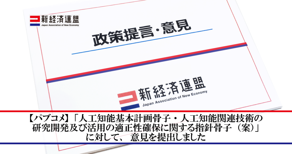 一般社団法人 新経済連盟は2025年11月27日、内閣府の科学技術・イノベーション推進事務局 人工知能政策推進室が募集した「人工知能基本計画骨子」「人工知能関連技術の研究開発及び活用の適正性確保に関する指針骨子」のパブリックコメントに対して、意見を提出しました。