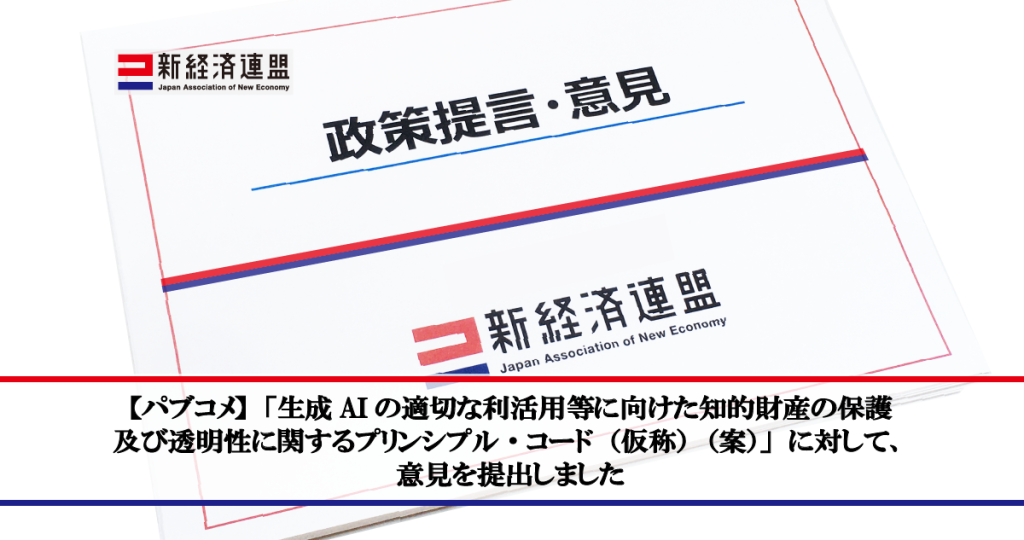 一般社団法人 新経済連盟は2026年1月26日、内閣府が実施した「生成AIの適切な利活用等に向けた知的財産の保護及び透明性に関するプリンシプル・コード(仮称)(案)」のパブリックコメントに対して、意見を提出しました。