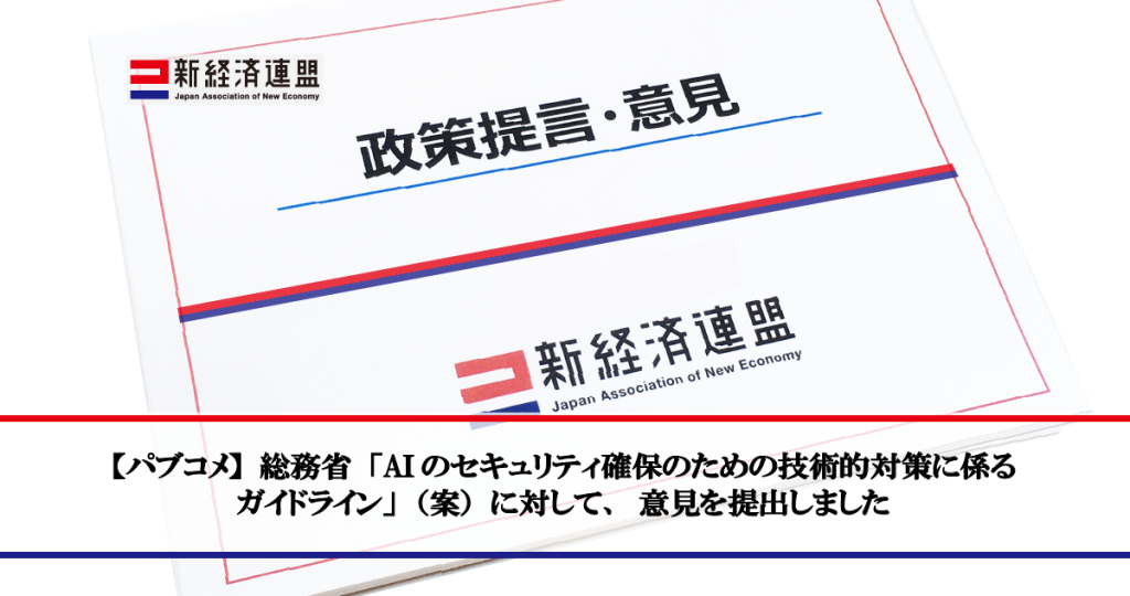 一般社団法人 新経済連盟は2026年1月29日、総務省が実施した「AIのセキュリティ確保のための技術的対策に係るガイドライン(案)」のパブリックコメントに対して、意見を提出しました。