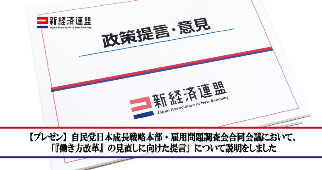 一般社団法人 新経済連盟は2026年3月5日、自由民主党日本成長戦略本部・雇用問題調査会合同会議において、「『働き方改革』の見直しに向けた提言」について説明しました。